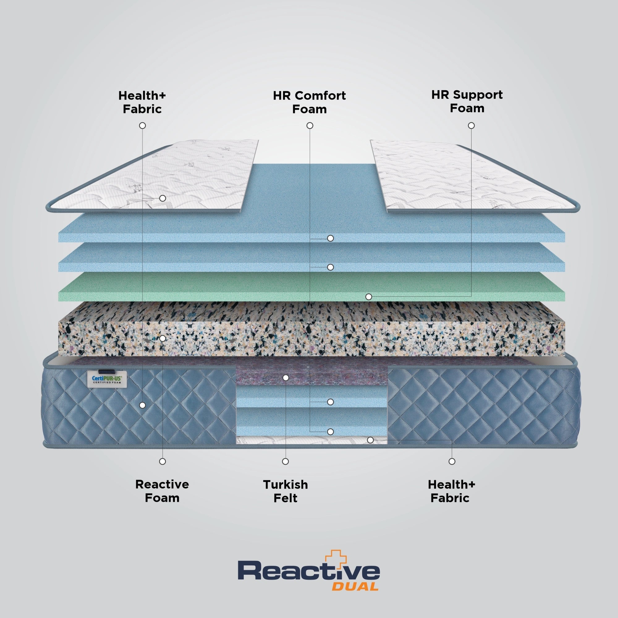 Designed with a stress-repairing concept, Reactive foam re-bonding shredded pieces of high-grade foams into a single piece. The process makes it very dense and provides a solid and firm support base. The extraordinary density ensures ample support for the spine and the optimal distribution of body weight.