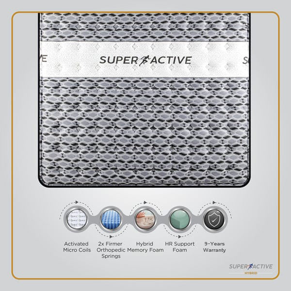 The Super Active Hybrid mattress is built with Comfort Foam layers. Which is constructed using Aero Sleep technology for adequate airflow and temperature regulation. This HR comfort foam gives your body the utmost comfort, enabling it to relax more easily.