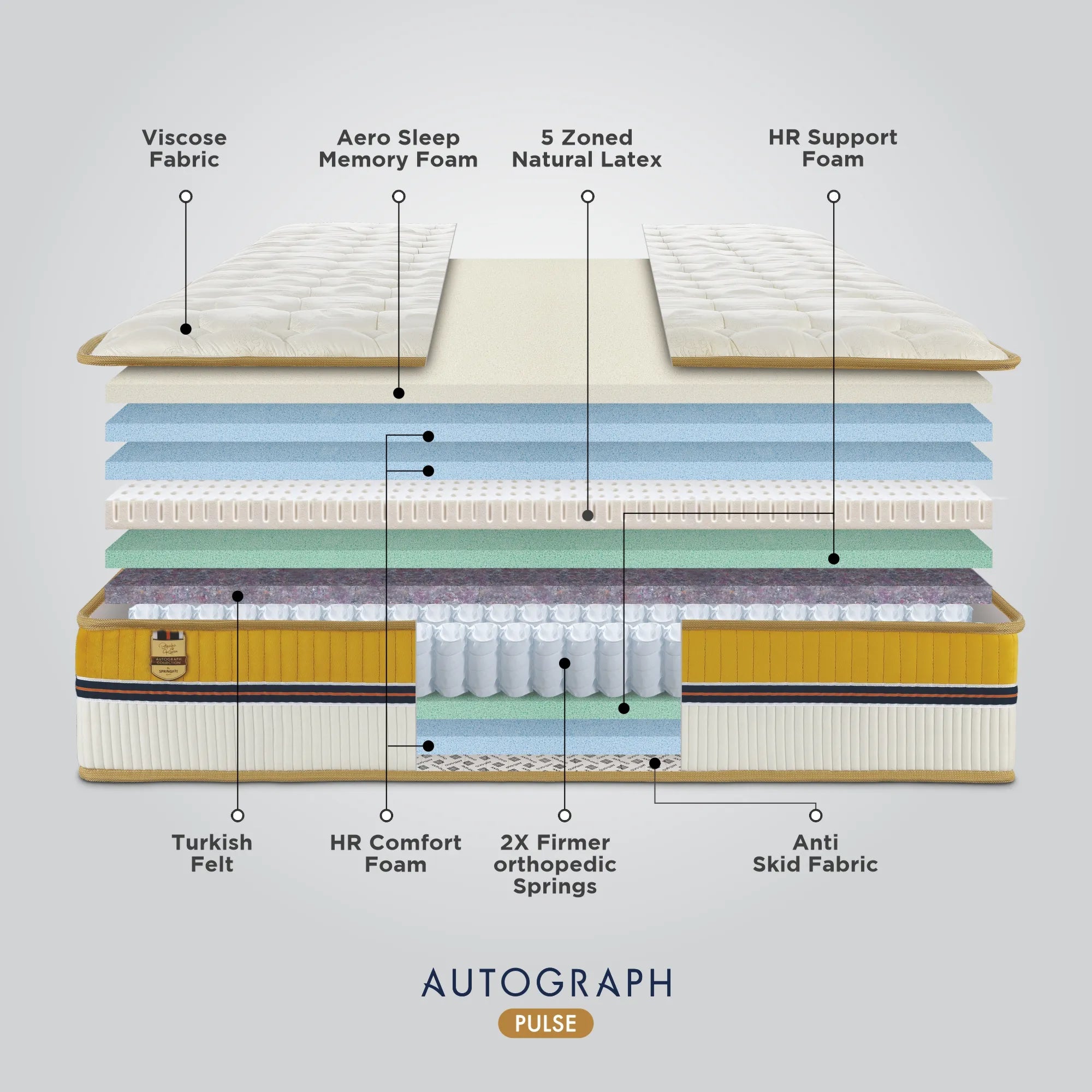 Springfit High Resilient Support Foam is a highly dense foam that acts as a transitional layer between the soft top layers and firm base of the mattress. This HR Support Foam is made with Aero Sleep technology hence promotes breathability and airflow.
